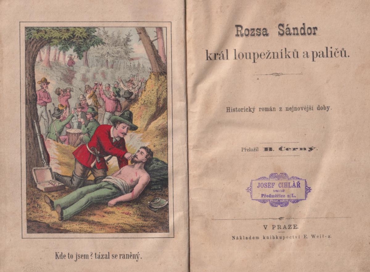 kniha, 4 x barev. litografie, ve frontispisu a tatáž opakovaně s 2 dalšími v přílohách, dále čb. xylografie v příloze, na přední a zadní předsádce totožná ilustrační rytina s uvězněným hrdinou a s názvem románu, ryl X.A. Řeháček, román o ve své době populární postavě uherského bandity Sándora Rózsy …