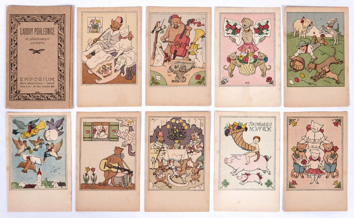 10 x příležitostných pohlednic /zinkografie/, Emporium, Serie III., tiskl Kope-Bellman, Praha Smíchov, zachovalý stav, 14,5 x 9,5 cm, žák prof. A. Hofbauera, E. Dítěte a H. Jakesche na VŠUP v Praze, člen SVU Mánes a SČUG Hollar
