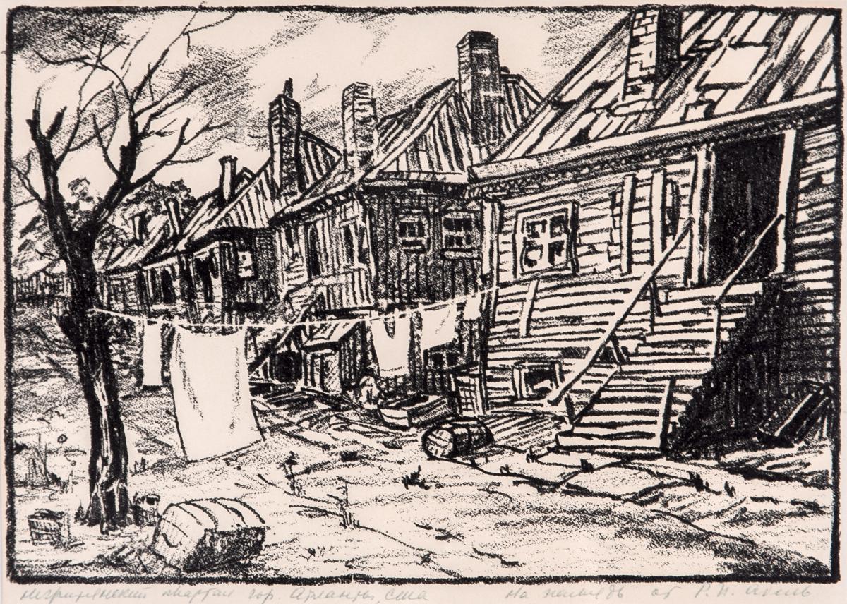 tuš, papír, 1976, 15, 8 x 23, 2 cm, sign. PD R. I. Abel, rám, Tento žánrový obrázek nakreslil Rudolf Ivanovič Abel, vlastním jménem William August Fisher, zpravodajský důstojník pracující na území USA pro sovětskou zpravodajskou službu MGB, resp. KGB. Dle prohlášení FBI šlo o největšího špiona 20. s…