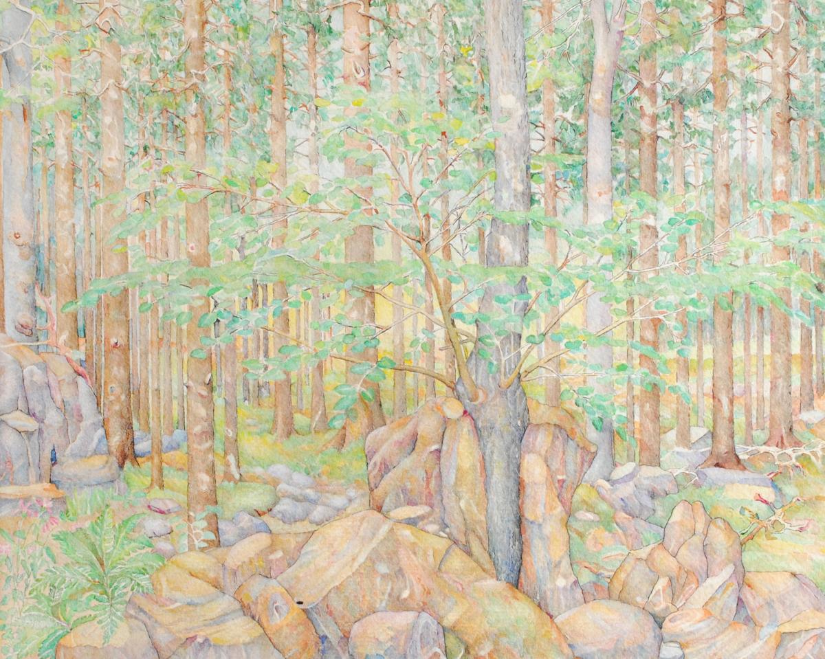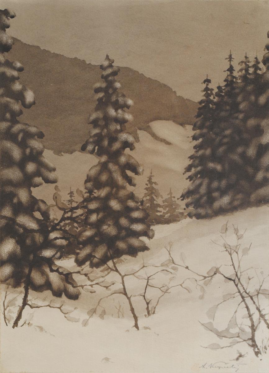 akvarel, tuš, papír, 24,1 x 29 cm, nalepeno na kartonu, okraje malby přilepeny papírovou páskou, malba bez vad, karton s páskou lehce zašlé s několika skvrnkami, Antiqari.at Radhošťská, antiqari.at Radhošťská