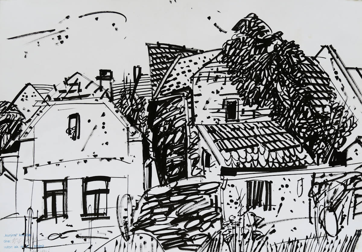 japonský fix, papír, 2007, 30 x 42,5 cm, sign. LD Hojný L. 15.6. 2007, Antikvariát Ostrovní, akademický malíř a grafik, absolvoval VŠUP v ateliéru prof. A. Strnadla. Posledních 20 let pracuje "v poli" - kresby téměř zásadně propojuje s texty.