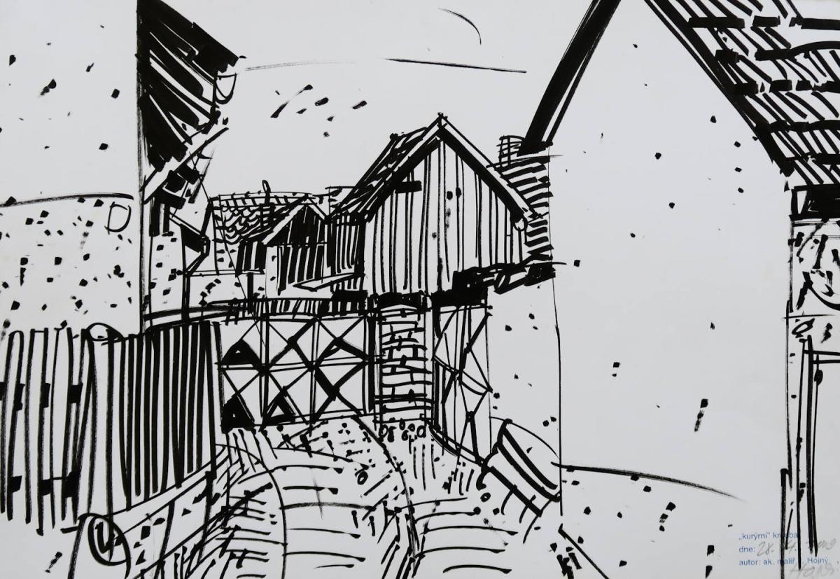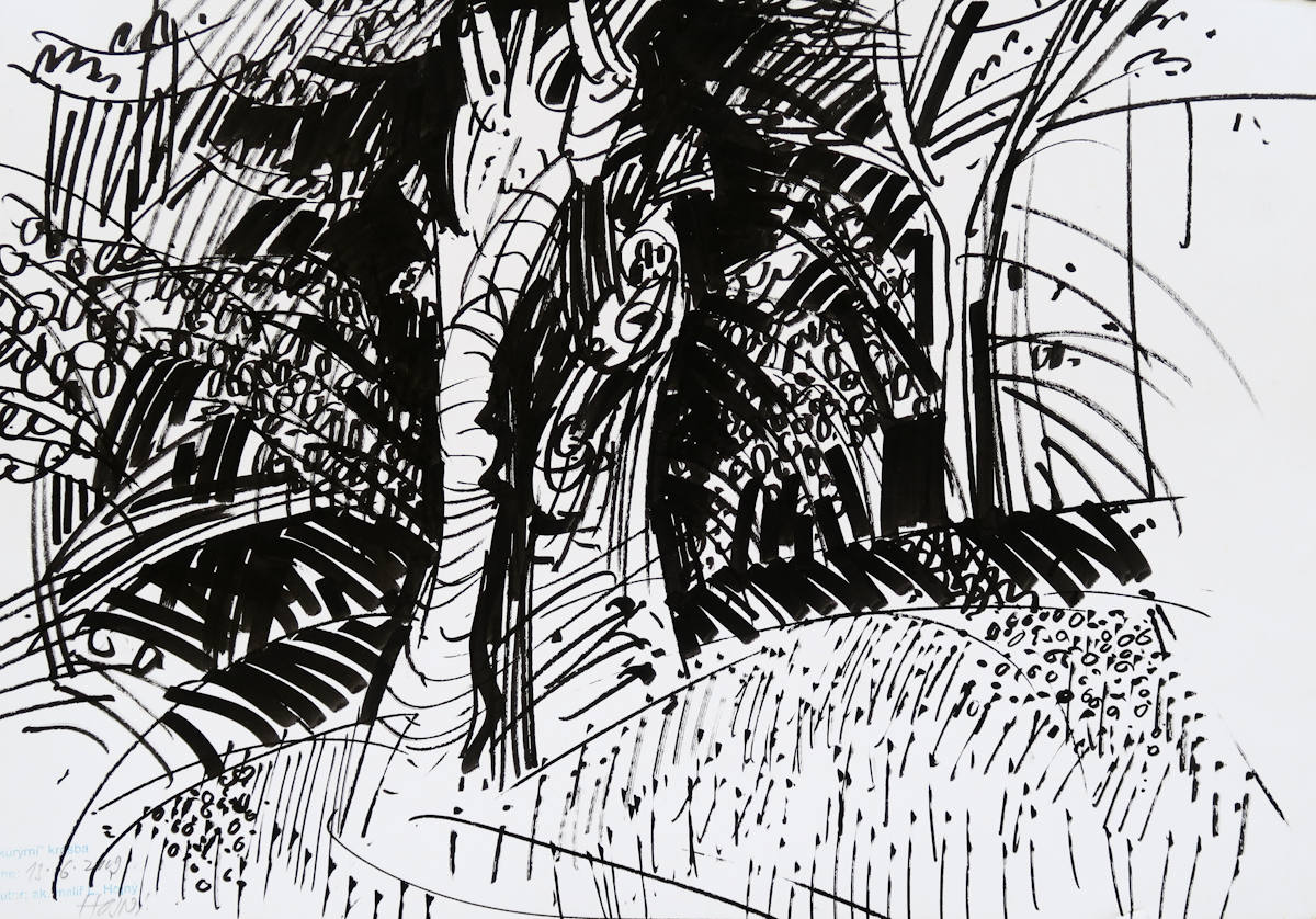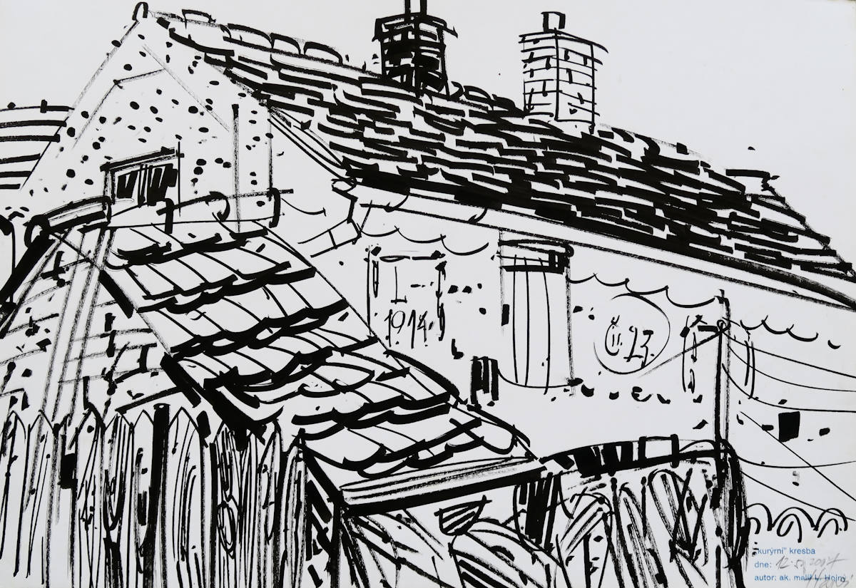 japonský fix, papír, 2009, 30 x 42,5 cm, sign. LD Hojný 13.6.2009, Antikvariát Ostrovní, akademický malíř a grafik, absolvoval VŠUP v ateliéru prof. A. Strnadla. Posledních 20 let pracuje "v poli" - kresby téměř zásadně propojuje s texty.