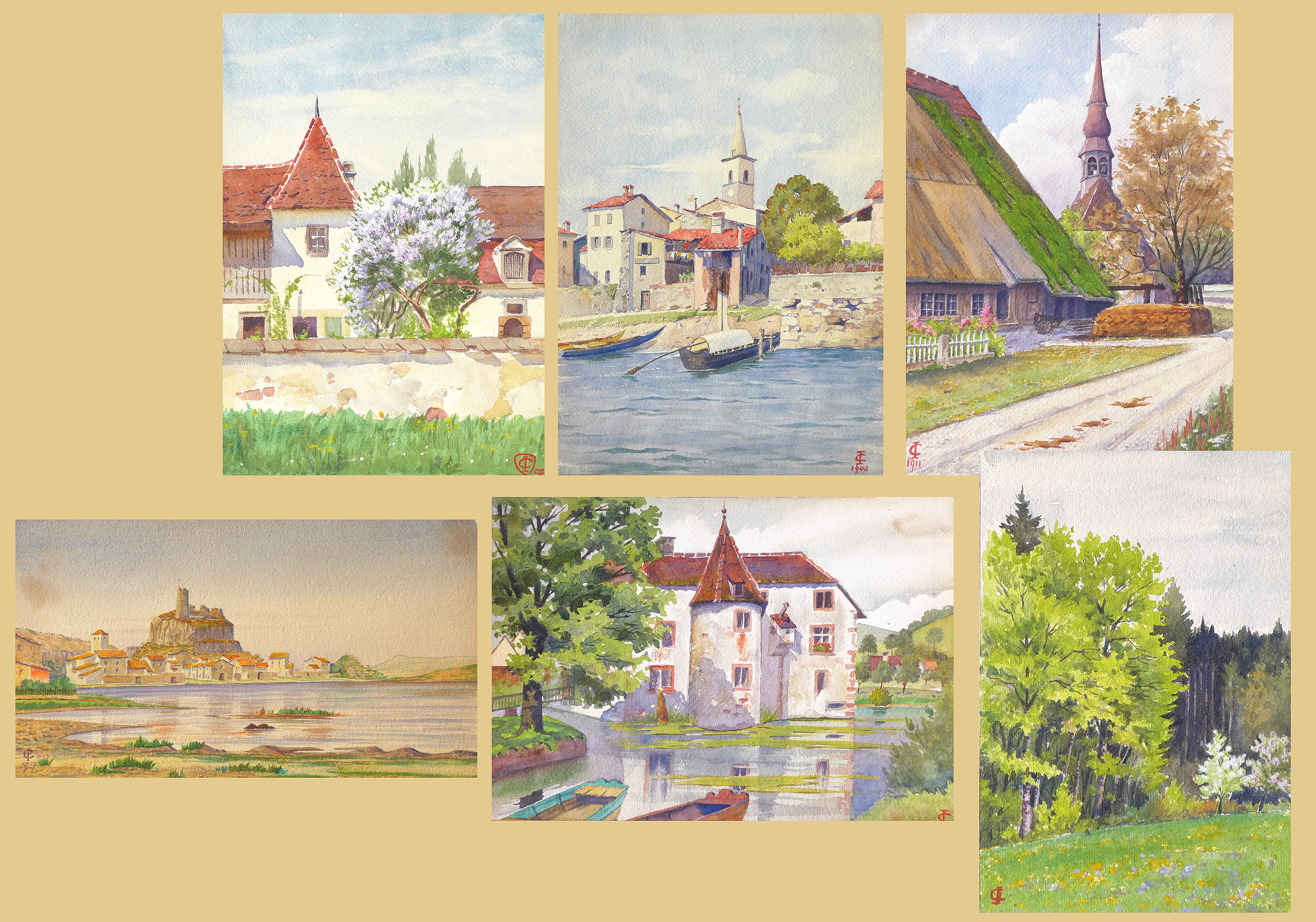 6x akvarel, papír, 1907-1927, 24 x 16 - 26 x 45 cm, vše monogr. CI, Antikvariát Dlážděná