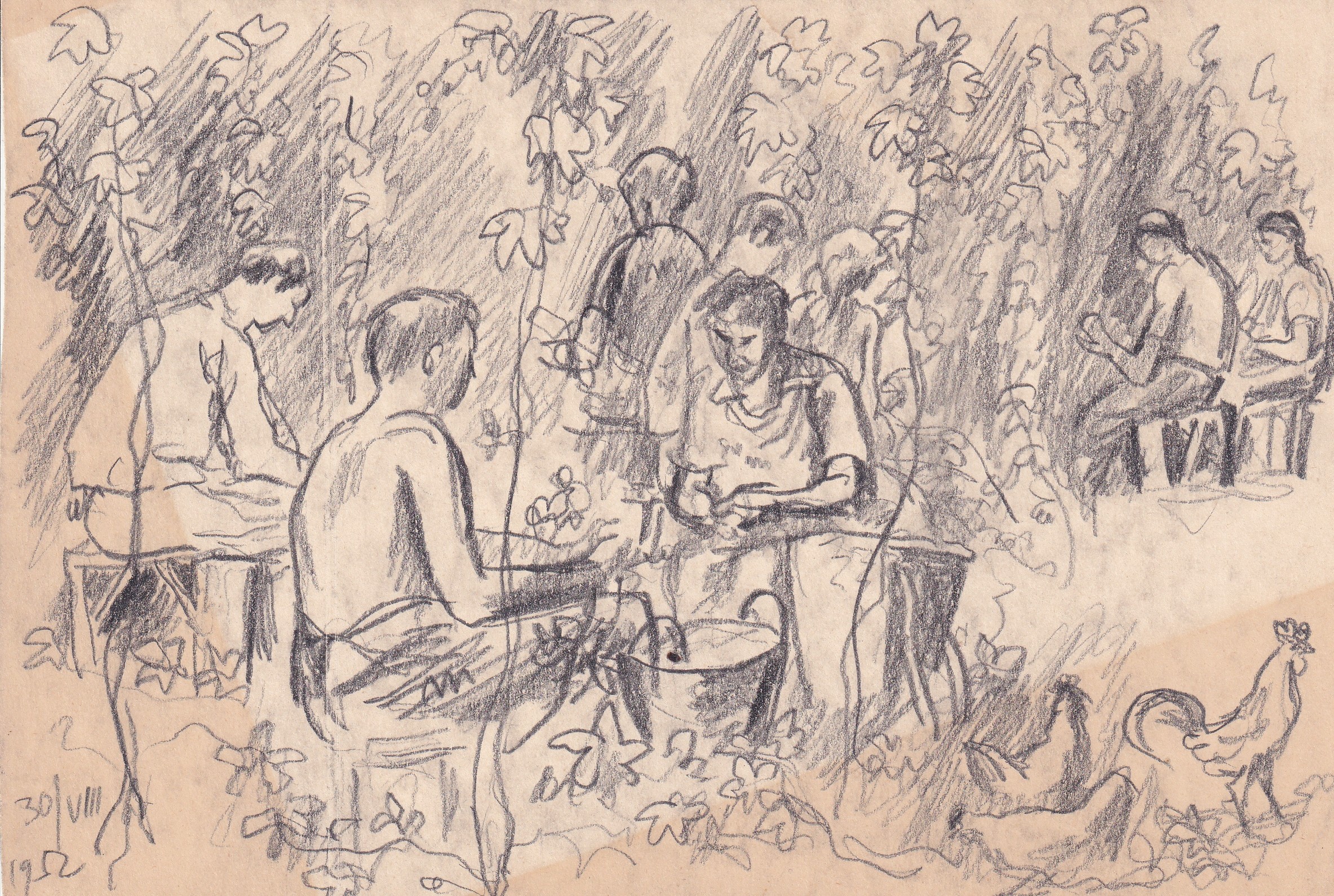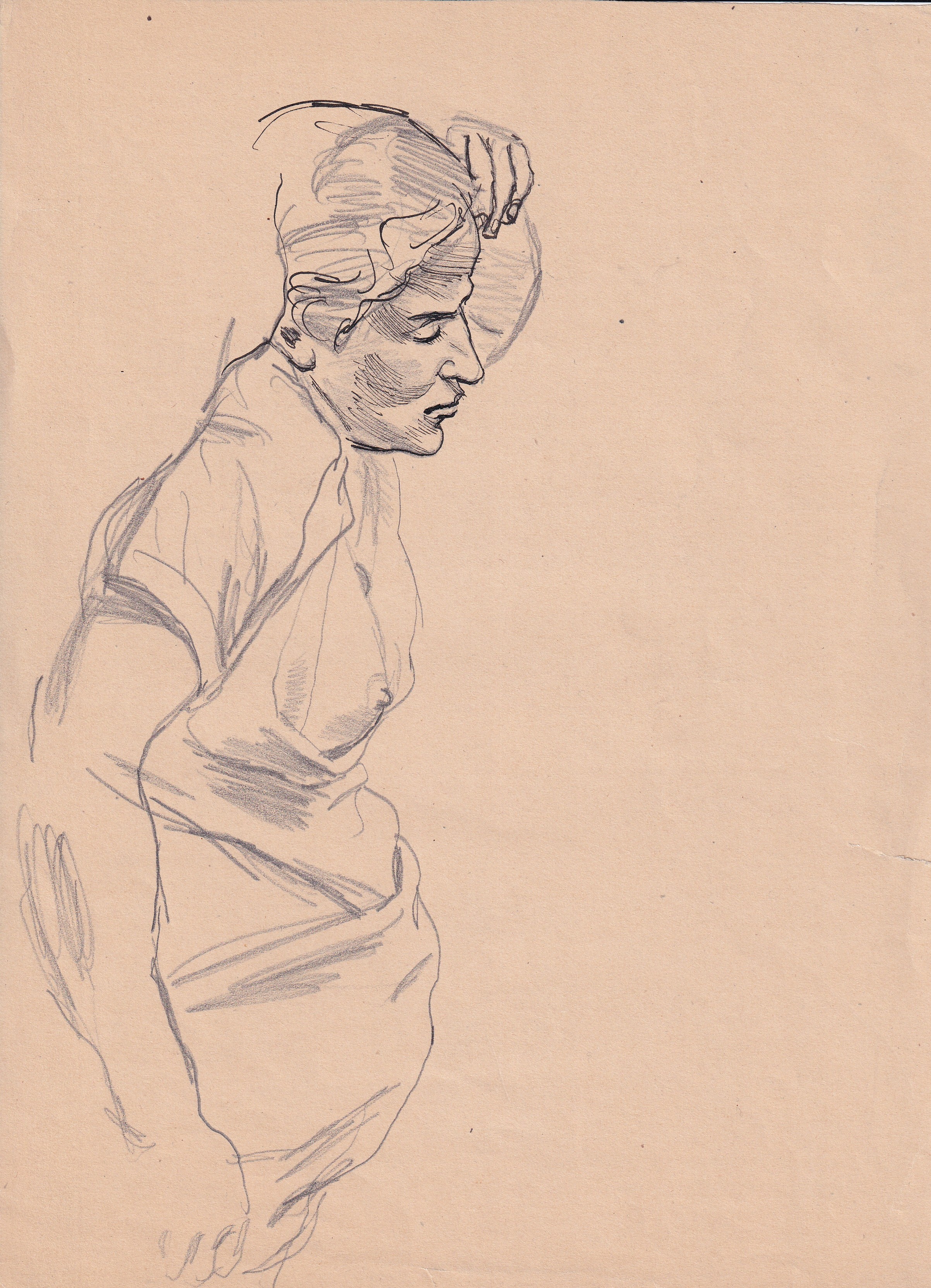 tužka, papír, 1952, 14 x 21 cm, místy zahnědlý papír, Antikvariát Dlážděná, studium u B. Dobiáše na Odborné škole keramické v Bechyni, žák prof. V. Maška a F. Kysely na UMPRUM, prof. M. Švabinského a T. F. Šimona na AVU v Praze, člen Umělecké besedy, SČVU, SČUG Hollar