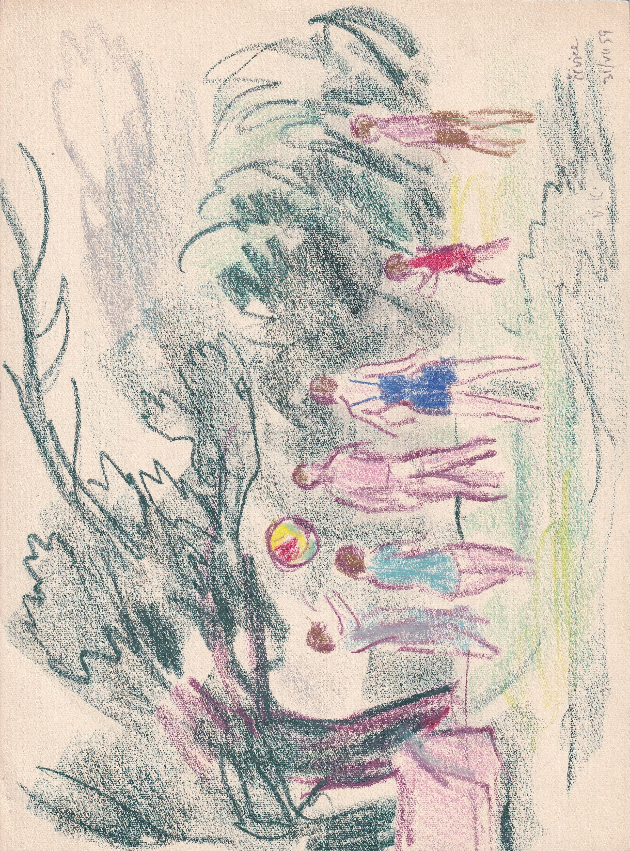 mastný pastel, papír, 1959, 21 x 28,8 cm, Antikvariát Dlážděná, studium u B. Dobiáše na Odborné škole keramické v Bechyni, žák prof. V. Maška a F. Kysely na UMPRUM, prof. M. Švabinského a T. F. Šimona na AVU v Praze, člen Umělecké besedy, SČVU, SČUG Hollar