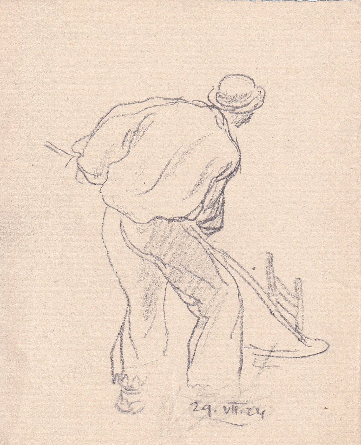 tužka, papír, 1919, 13,9 x 20,2 cm, Antikvariát Dlážděná, studium u B. Dobiáše na Odborné škole keramické v Bechyni, žák prof. V. Maška a F. Kysely na UMPRUM, prof. M. Švabinského a T. F. Šimona na AVU v Praze, člen Umělecké besedy, SČVU, SČUG Hollar