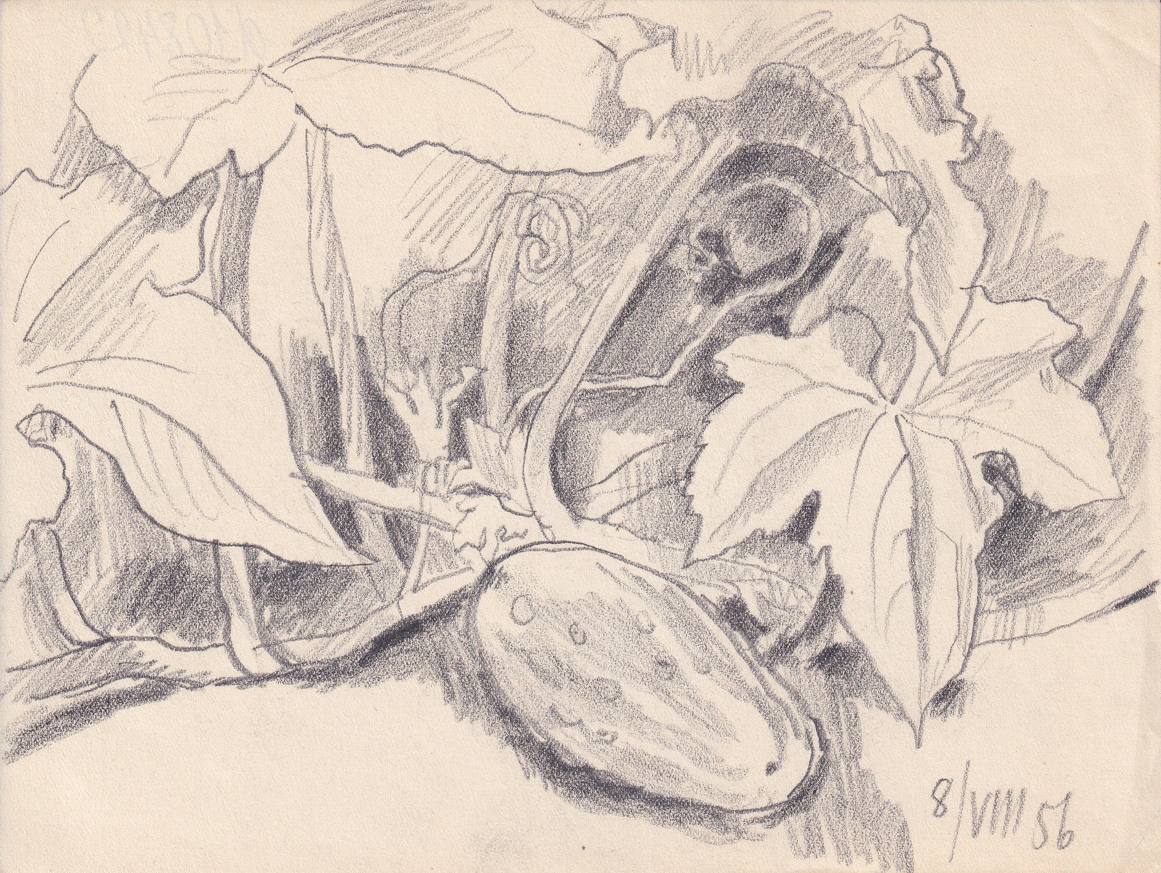 tužka, papír, 1956, 15 x 19,7 cm, Antikvariát Dlážděná, studium u B. Dobiáše na Odborné škole keramické v Bechyni, žák prof. V. Maška a F. Kysely na UMPRUM, prof. M. Švabinského a T. F. Šimona na AVU v Praze, člen Umělecké besedy, SČVU, SČUG Hollar