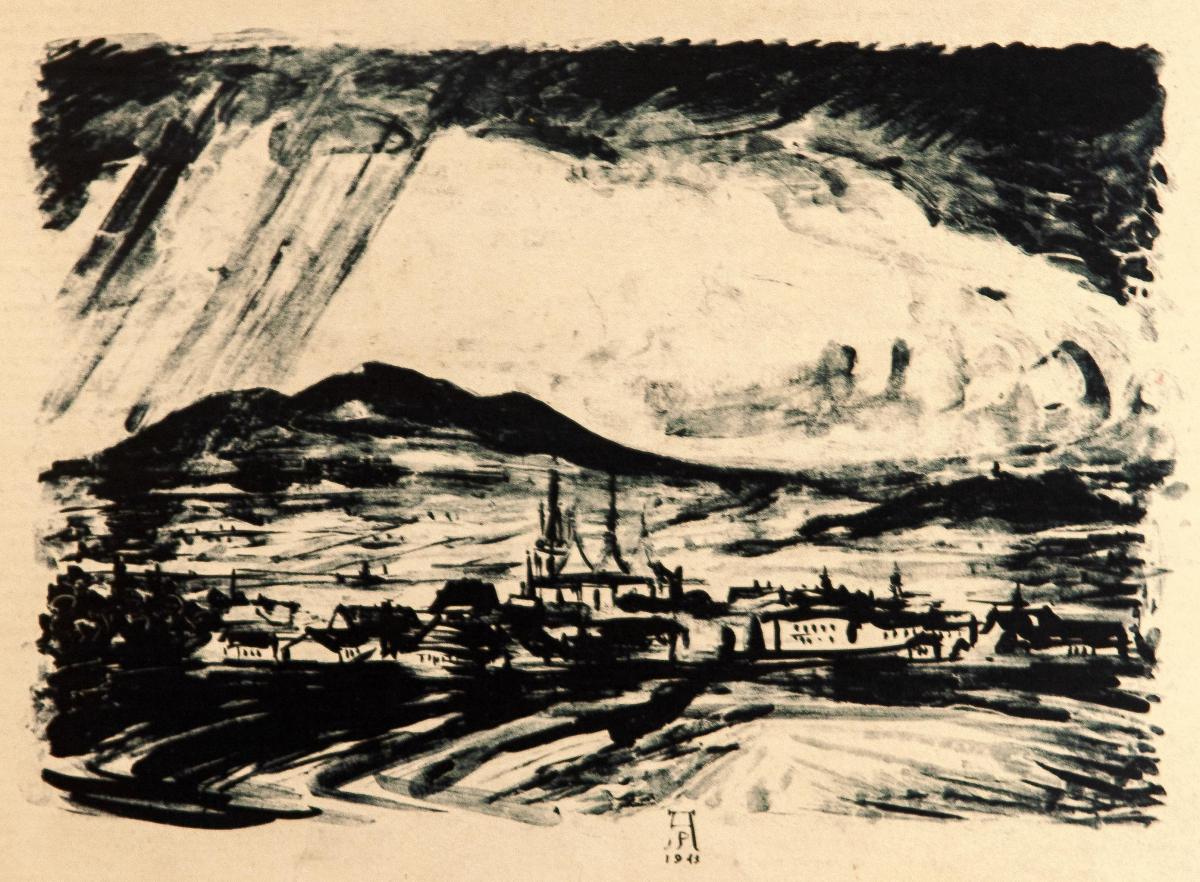 tisk, 1943, 29,5 x 40 cm, značeno v tisku DU 1943, Antiqari.at Radhošťská, antiqari.at Radhošťská, žák prof. J. Loukoty a J. Obrovského na AVU v Praze, prof. Matějčka a J. Mukařovského na FF UK tamtéž