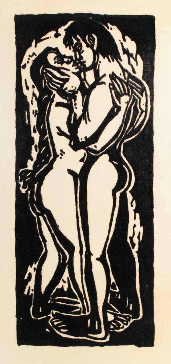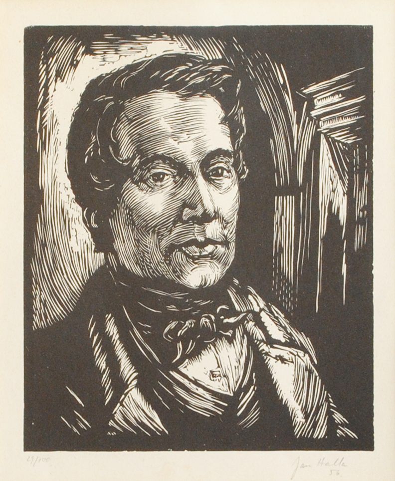 dřevoryt, 18,5 x 15,5 cm, sign. PD Jan Halla, pasparta, nátisk, papír lehce zažloutlý, pasparta v levém dolním rohu poškozena vodou, látková páska kolem pasparty místy ušpiněna, Aantiqari.at Radhošťská,