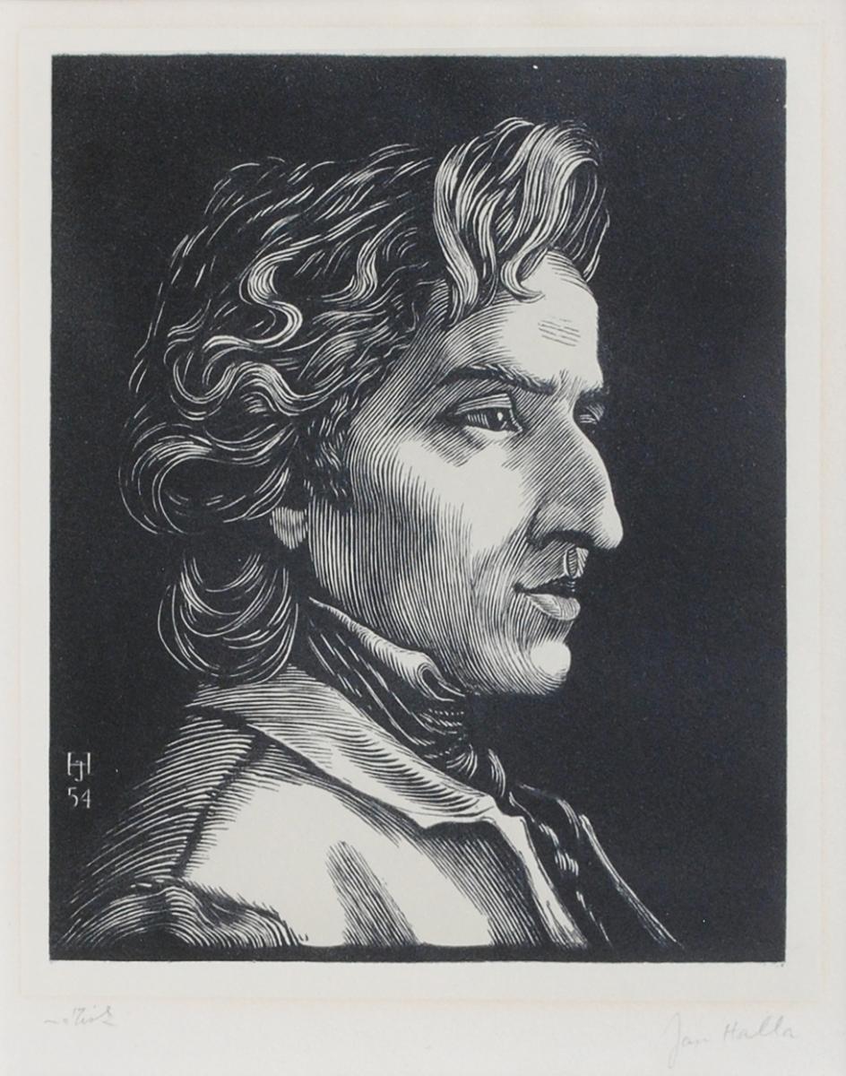 dřevoryt, 1956, 17,6 x 14,9 cm, sign. PD Jan Halla 56, pasparta, č. 29/100, látková páska od pasparty po celé pravé délce odchlíplá, Aantiqari.at Radhošťská,