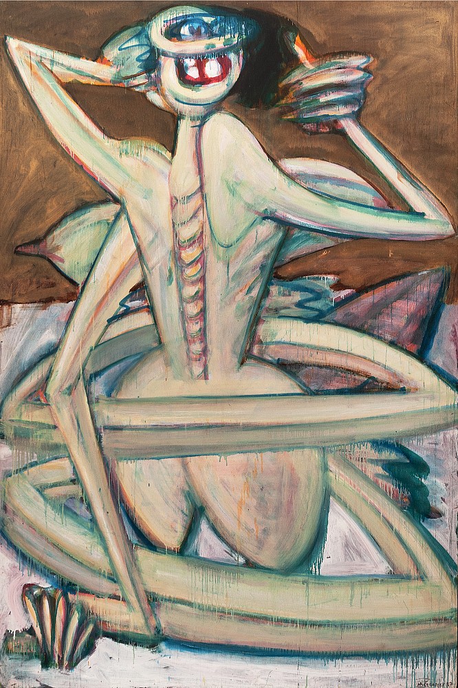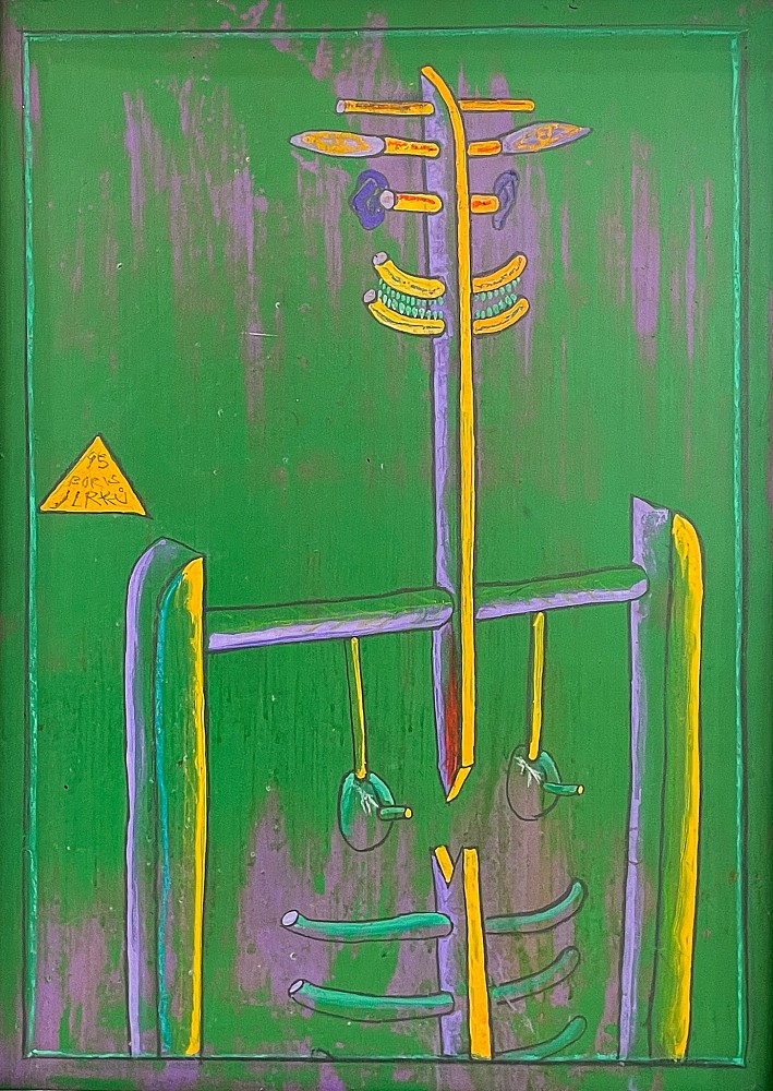 tuš, akvarel, papír, 13 x 17 cm, zezadu razítko Neprakta, rám, Dikobraz 8. 2. 1984, studium na SPŠ grafické v Praze a na Přírodovědecké fakultě UK tamtéž