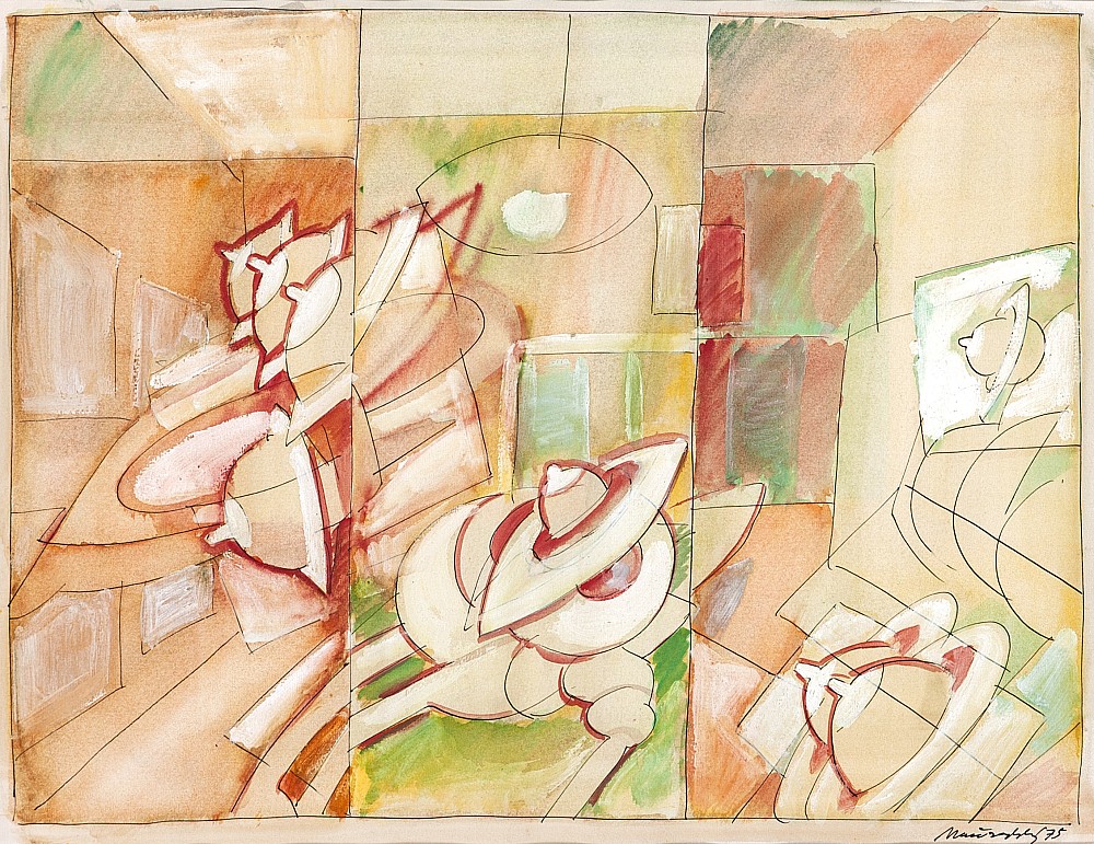 tempera, kvaš, uhel, kombinovaná technika, papír, 1967, 34,5 x 49,5 cm, sign. PN Načeradský, rám, posouzeno kurátorem a správcem umělecké pozůstalosti autora Petrem Machem, hravá ukázka z díla jednoho z vůdčích představitelů Nové figurace a České grotesky. Načeradský vystudoval Akademii výtvarných u…