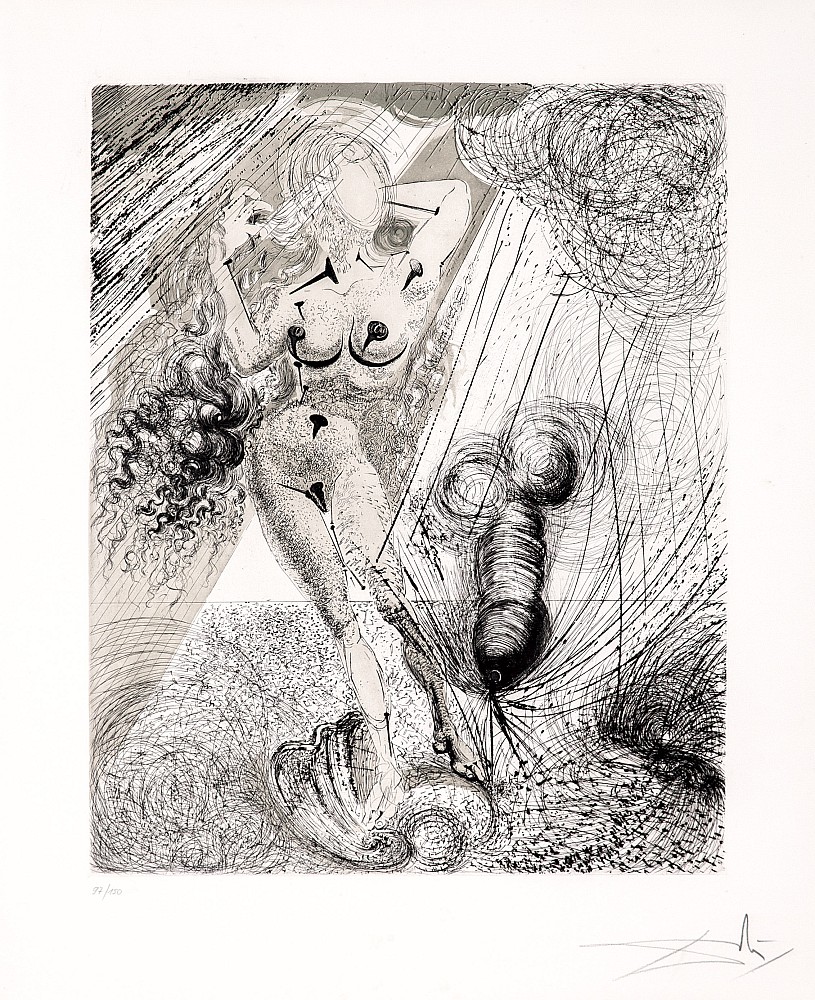 suchá jehla, 48,5 x 39,5 cm, sign. PD Dalí, rám, č. 183/450, Z cyklu Mythologie 1963/5. Soubor 16 grafických listů. Grafický list s motivem Afrodité od Salvadora Dalího představuje mimořádně komplexní ikonografickou reinterpretaci jednoho z nejstarších a nejvíce kanonizovaných mýtů západní kultury. …