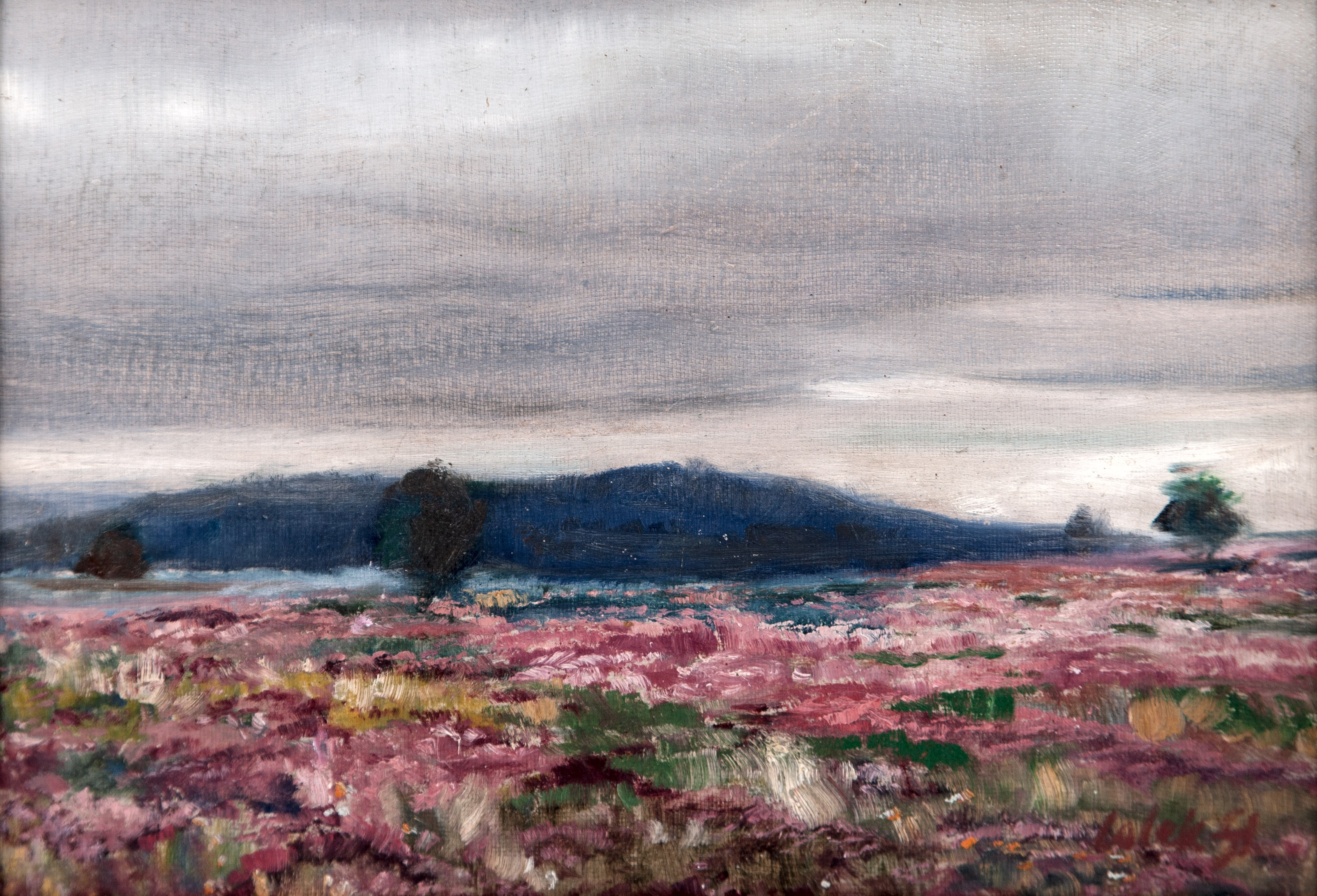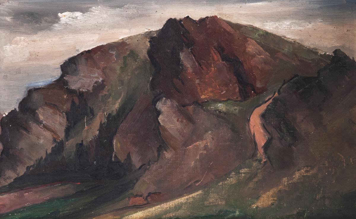 olej, dřevo, 22 x 35 cm, rám, dynamická krajinná studie je ukázkou expresivního talentu Josefa Hubáčka. Autor zde s monumentálním citem zachycuje masiv hor pomocí hutných nánosů barev a energických tahů štětce. Paleta zemitých tónů, oživená světlejšími akcenty cesty a úpatí, dodává výjevu syrovost a…