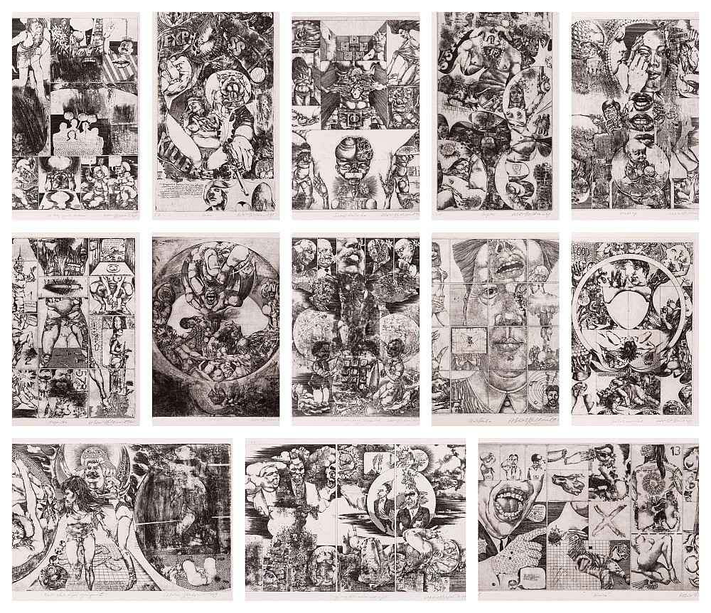 13x lept, 1967-71, autorský tisk, kompletní soubor, v letech 1967 až 1969 vytvořil Oldřich Kulhánek sérii politicky angažovaných leptů s existencionálními motivy. Většina z nich je formátována pop-artově komiksovou formou, kdy umělec použil tváře a postavy krásných dívek, tváře byrokratů a politiků,…