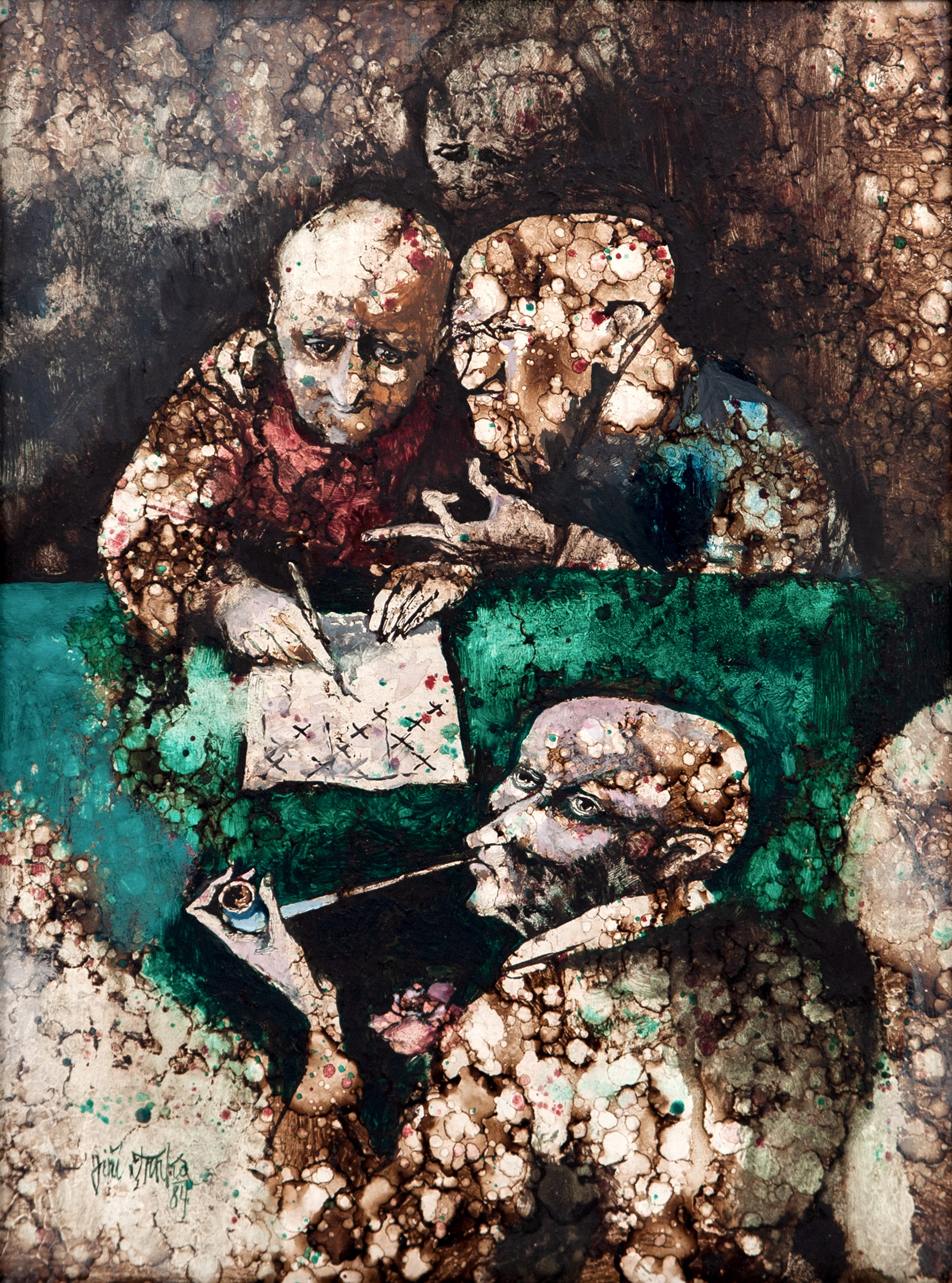 akvarel, tuš, běloba, papír, 1975, 44,5 x 59 cm, sign. PD Načeradský 75, rám, mimořádný kreslířský talent Načeradskému umožňoval výtvarně zpracovávat náměty od vážných až po vyloženě groteskní, jak vidíme na předloženém díle. Jeho vysoký intelekt v kombinaci s malířským a kreslířským mistrovstvím ho…