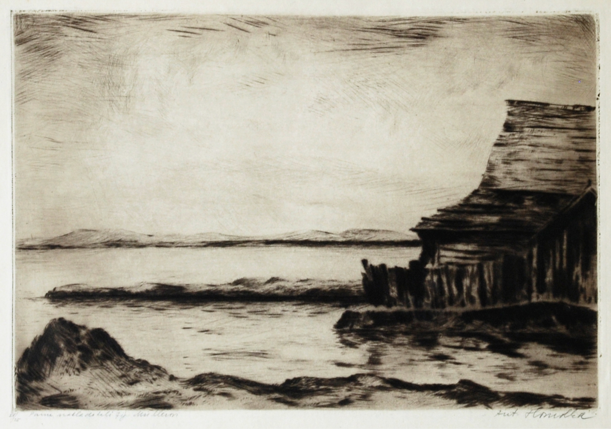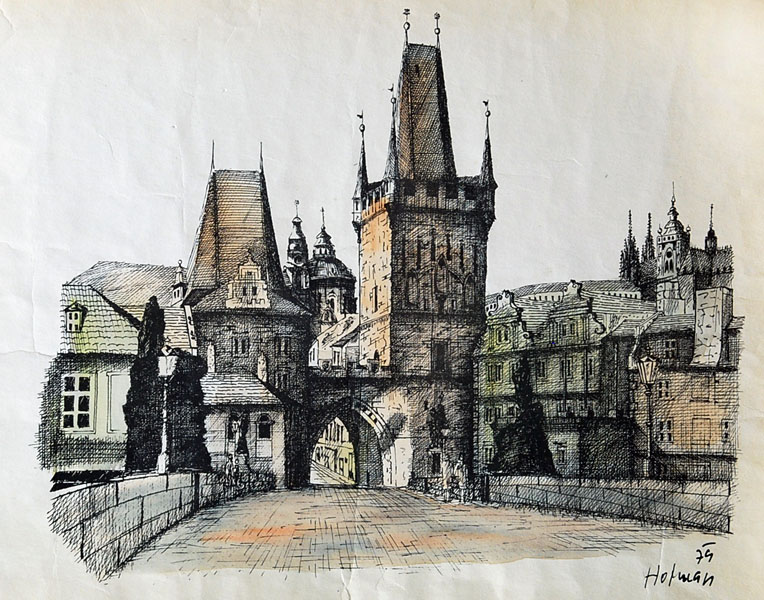 suchá jehla, 20,2 x 29,9 cm, sign. PD Ant. Homolka, 21/25, s věnováním: Panu nakladateli F. J. Müllerovi, mírně zašpiněný a pokrčený papír, Antikvariát Dlážděná, žák prof. Bendy na UPŠ v Praze, prof. W. Nowaka a T. F. Šimona na AVU tamtéž, člen SČUG Hollar