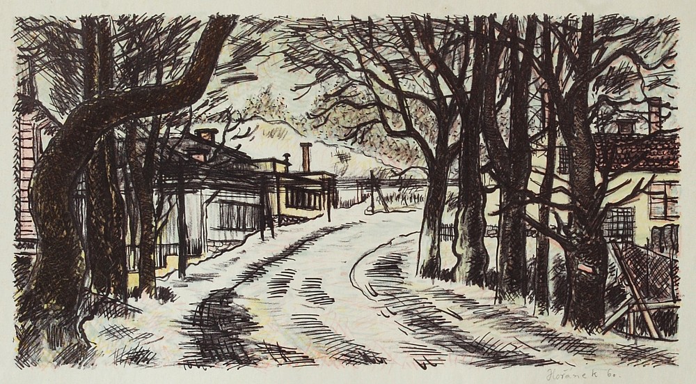 litografie, 1960, 19 x 35, 2 cm, sign. PD Hořánek 60, na papíře skvrny, Antikvariát Dlážděná, žák J. Obrovského a V. Nechleby na AVU v Praze, člen Jednoty umělců výtvarných, SVU Mánes a předseda SČUG Hollar