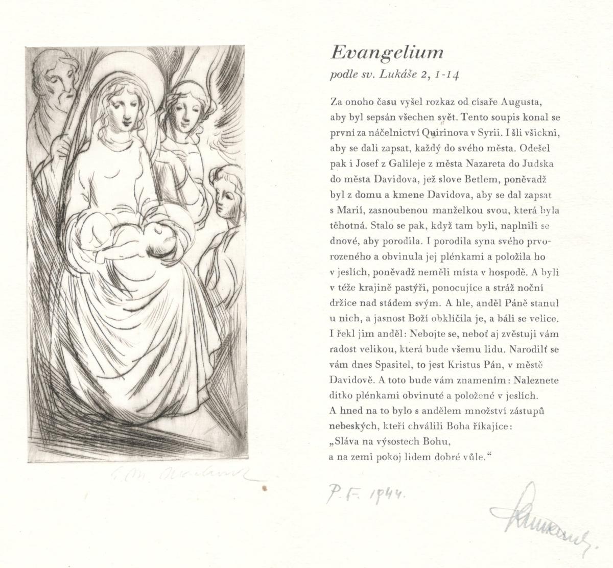 suchá jehla, 1943, 13 x 6,5 cm, sign. PD, papír uprostřed přeložen: na levé straně grafika, na pravé straně Evangelium podle Lukáše 2, 1-14, u signatury hnědá skvrnka, Antiqari.at Radhošťská, antiqari.at Radhošťská
