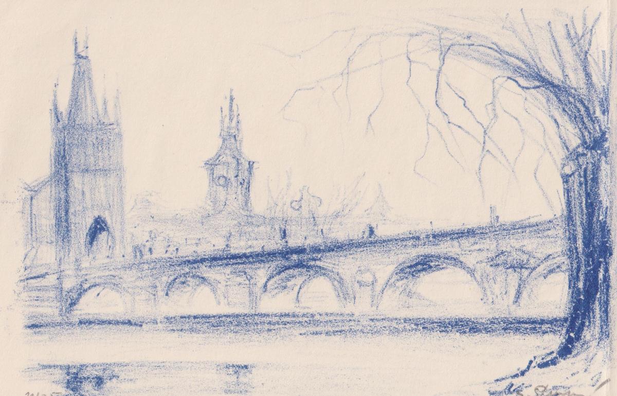 litografie, 10,5 x 8,4 cm, sign. PD, papír uprostřed přeložen - na pravé půlce papíru grafika, na levé PF 1977 Dr. Václav Šmejkal, papír zašlý a u horního okraje ušpiněn, Antiqari.at Radhošťská, antiqari.at Radhošťská