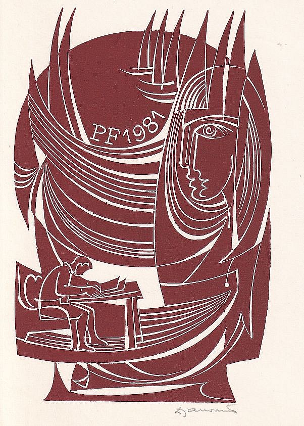 sítotisk, 1980, 13,5 x 9 cm, sign. PD, text: PF 1981 přeje Václav Baštinec s rodinou, Provenance: Antiquarian Dlážděná, studied at The Tertiary School of Applied Arts in Brno at the atelier of prof. K. Langer, the disciple of prof. E. Nevan at The Faculty of Education - Comenius University in Bratis…