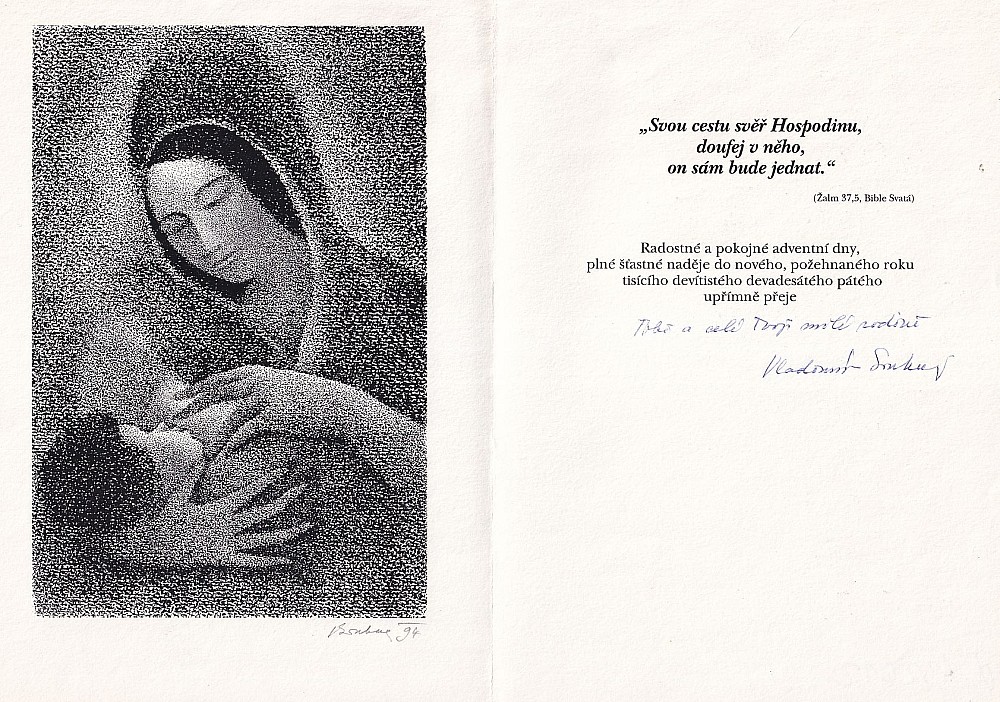 sítotisk, 1994, 17 x 11,2 cm, sign. PD VSoukup 94, napsané přání: Tobě a celé Tvoji milé rodině Vladimír Soukup, Provenance: Antiquarian Dlážděná
