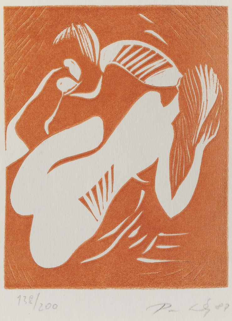linoryt, 1983, 11,6 x 9,8 cm, sign. PD Pastorák 83, č. 138/200, papír uprostřed přeložen - na levé půlce papíru grafika, na pravé půlce papíru PF 1984, Burdátš, Aantiqari.at Radhošťská,