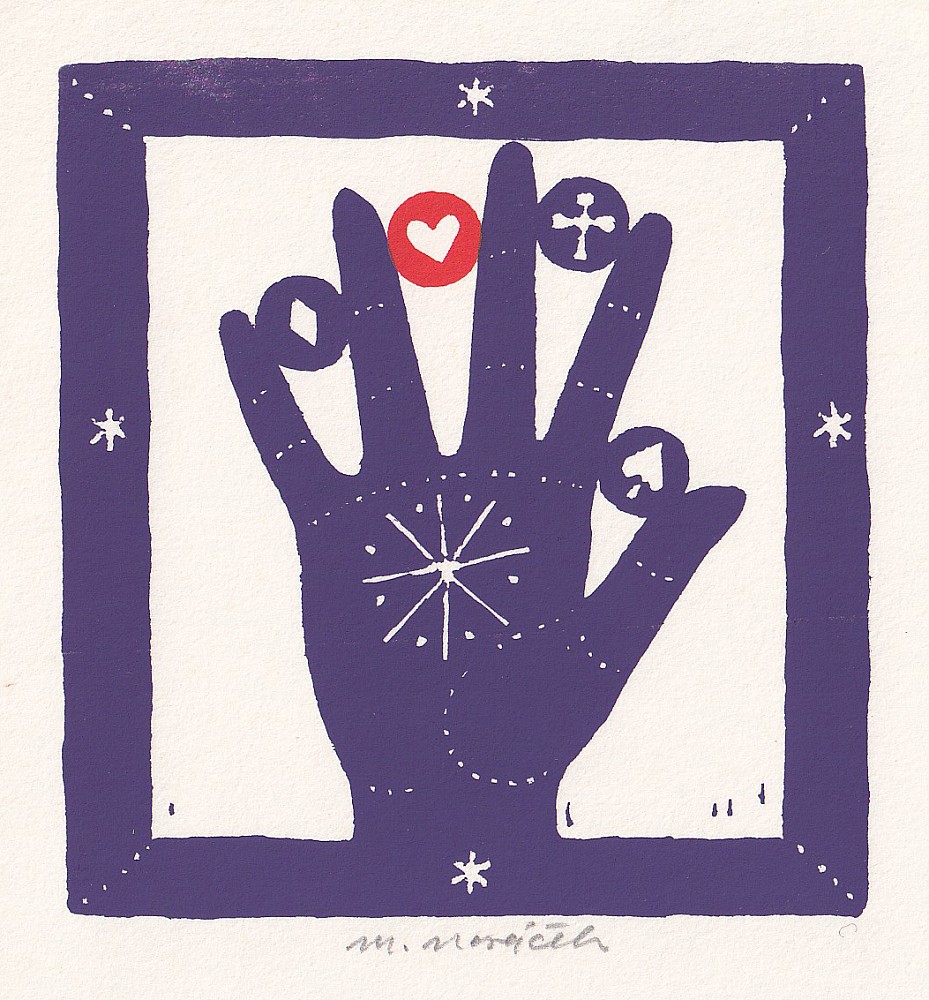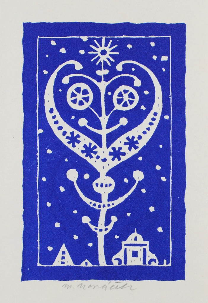 dřevořez, 1969?, 10,5 x 6,5 cm, sign. DU M. Nováček, uvnitř vepsáno PF 1970 a blíž neurčená signatura, Aantiqari.at Radhošťská,