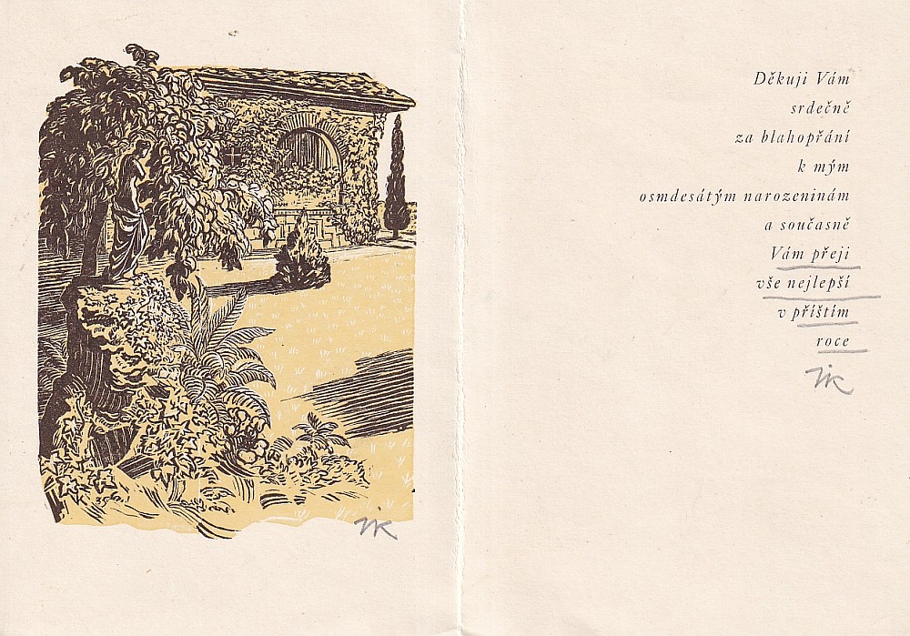 dřevoryt, 11,5 x 8,8 cm, sign. PD Vik, natištěný text: Děkuji Vám srdečně za blahopřání k mým osmdesátým narozeninám a současně Vám přeji vše nejlepší v příštím roce Vik, Provenance: Antiquarian Dlážděná, studied at The Secondary Art School of Weaving in Lomnice nad Popelkou, the disciple of prof. R…