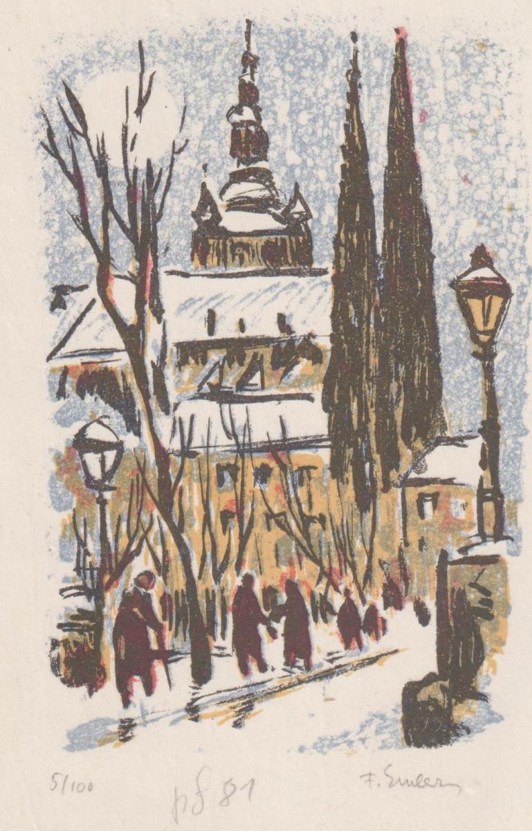 litografie, 1980, 12 x 8 cm, sign. PD F. Emler, č. 5/100, Aantiqari.at Radhošťská, , the disciple of prof. O. Nejedly and V. Pukl at The Academy of Fine Arts in Prague