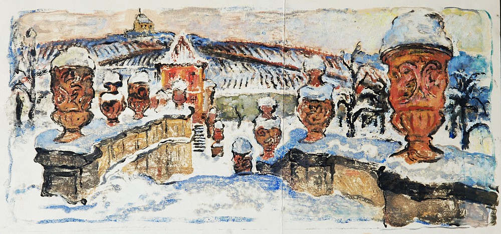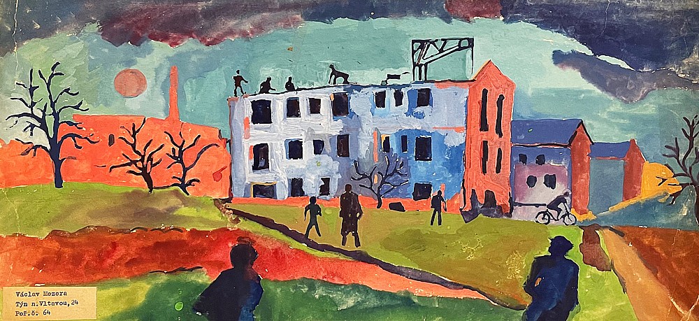 akvarel, tempera, papír, 22,5 x 48,5 cm, pokrčený papír, Antikvariát Dlážděná
