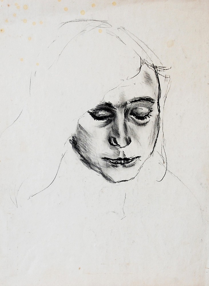 monotyp, papír, 29,5 x 53,2 cm, uprostřed ohnutý papír, skvrny na papíře, Antikvariát Dlážděná, žákyně prof. J. Obrovského a K. Mináře na AVU v Praze, členka Armádního výtvarného studia a SČVU