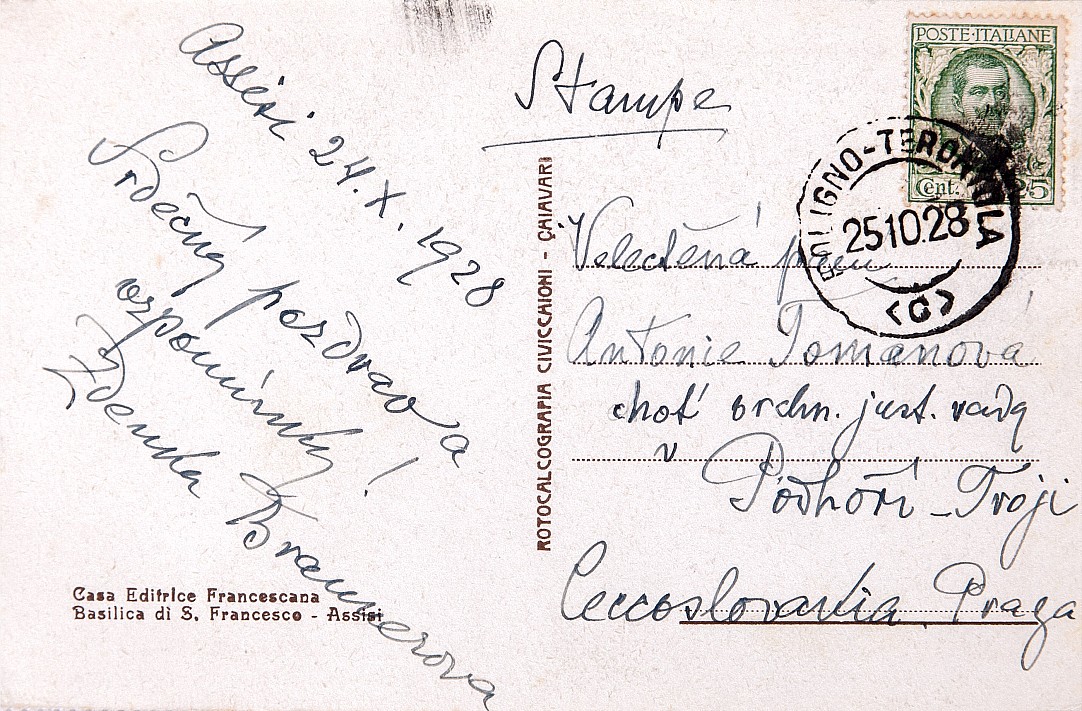 pohlednice, 1928, 9 x 13,8 cm, Vlastnoručně psaná pohlednice odeslaná z Assisi 24.X.1928, Provenance: Antiquarian Dlážděná, disciple of S. Pinkas and A. Chittusi, member of The Manes Association of Fine Artists