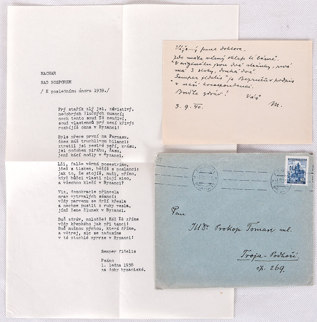 dopis, 1940, 28,8 x 23 cm, strojopisný Macharův oklep básně Nad Bosporem napsané 1. ledna 1938, připojen rukopisný lístek z 3.9.1940., v původní obálce, Provenance: Antiquarian Dlážděná