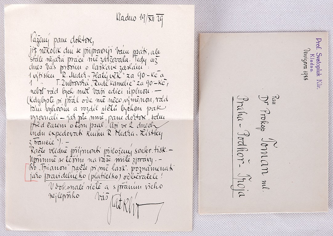 dopis, 1929, 20,3 x 15,8 cm, Rukopisný signovaný dopis z Kladna z 19.XII.1929, v původní obálce. Český malíř, grafik, typograf a nakladatel edice Zodiak., Provenance: Antiquarian Dlážděná, the disciple of prof. Dite and A. Hofbauer