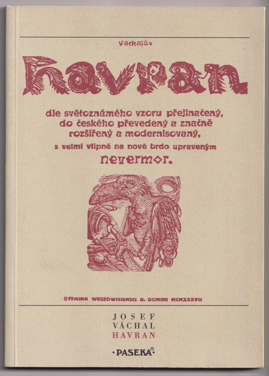 kniha, Váchalova parodie na slavnou báseň E.A.Poea, Havran v překladu V. Nezvala, dále Poeův originál a uzavírá faksimile 15ti dřevorytů Váchalova grafického souboru E.A. Poe v dřevorytu vydaného v Pourově edici, uspořádal a závěr. studii I. Kruis, úprava P. Štefan, vydala Paseka, Praha 1996, brož, …