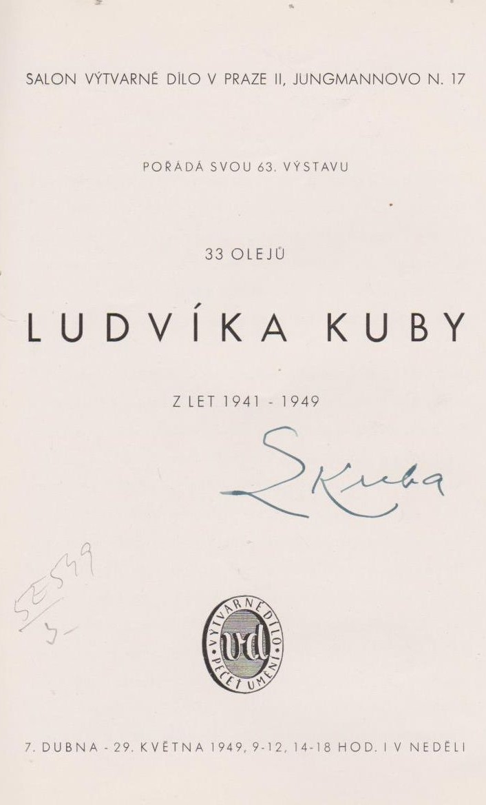 katalog, 21 x 15 cm, podpis výtvarníka na titl. straně, vyd. Salon výtvarného díla Praha ke své 63. prodejní výstavě 33 olejů L. Kuby z let 1941 - 1949, Praha, 1949, sešit bez obálky, bez výrazného poškození, Antikvariát Dlážděná, žák prof. M. Pirnera