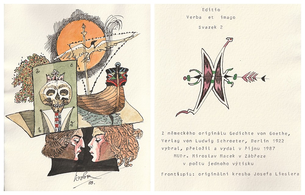 bibliofilie, 21,5 x 15 cm, orig. kolorovaná kresba J. Liesler ve frontispisu a v tiráži, přeložil a vydal MUDr. Miroslav Macek v Zábřeze v počtu jednoho výtisku, 1987, zkušební výtisk, šité archy v obálce, ruční papír, nestr., výborný stav, Antikvariát Dlážděná, žák prof. C. Boudy, O. Blažíčka, člen…