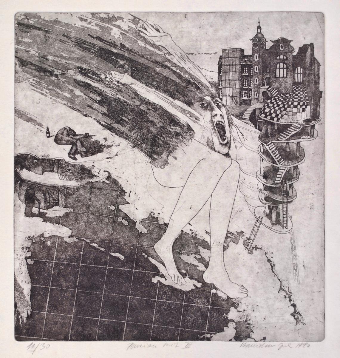 akvatinta, lept, suchá jehla, 1990/1991, 32,5 x 25 cm, sign. PD Jana Kadlecová 1990/91, č. 20/80, rožky nepatrně ohnuté, Antiqari.at Radhošťská, antiqari.at Radhošťská, žákyně prof. L. Čepeláka na AVU v Praze