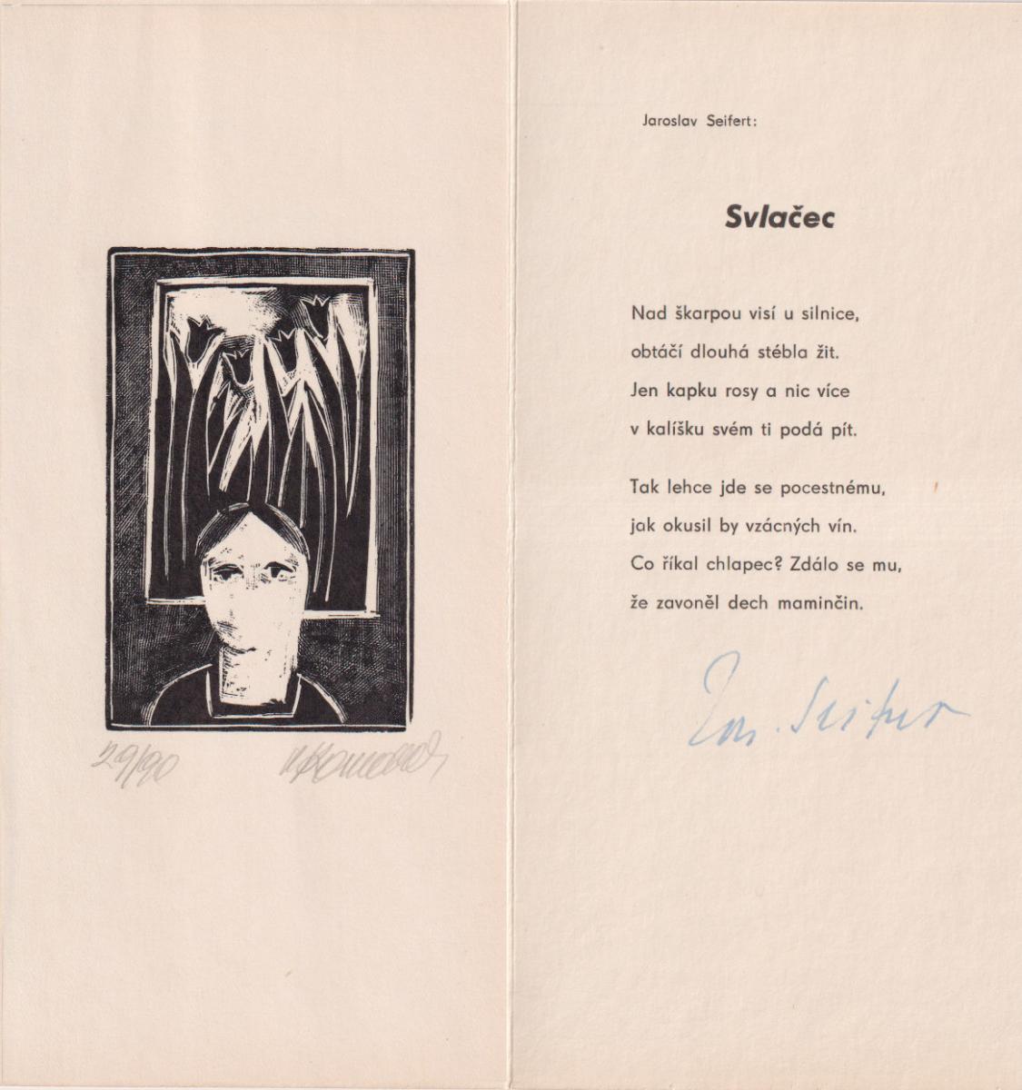 dřevoryt, 11,2 x 7,6 cm, sign. PD VKomárek, č. 24/80, sign. báseň J. Seiferta, Edice Éra, org. papír. přebal, výborný stav, Antikvariát Ostrovní, žák prof. K. Mináře na AVU v Praze a K. Štipla na VŠUP v Praze, člen SČUG Hollar a SČVU