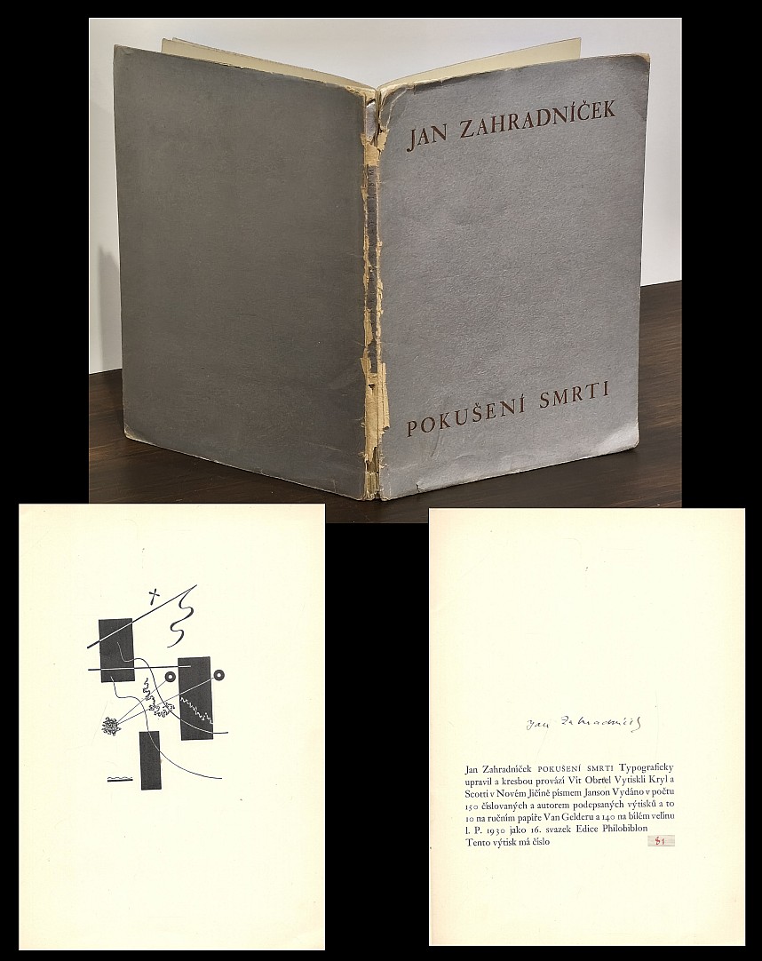 bibliofilie, zcela ojediněle se objevující exemplář Zahradníčkovy sbírky básní s podpisem v tiráži, vyd. jako 16. svazek Edice Philobiblon, 1930, ex. 81/150, upravil a úvodní kresbou provází Vít Obrtel, tisk Kryl a Scotti v Novém Jičíně, pův. brož, 76s., chatrný a poškozený hřbet, rozvolněná předsád…