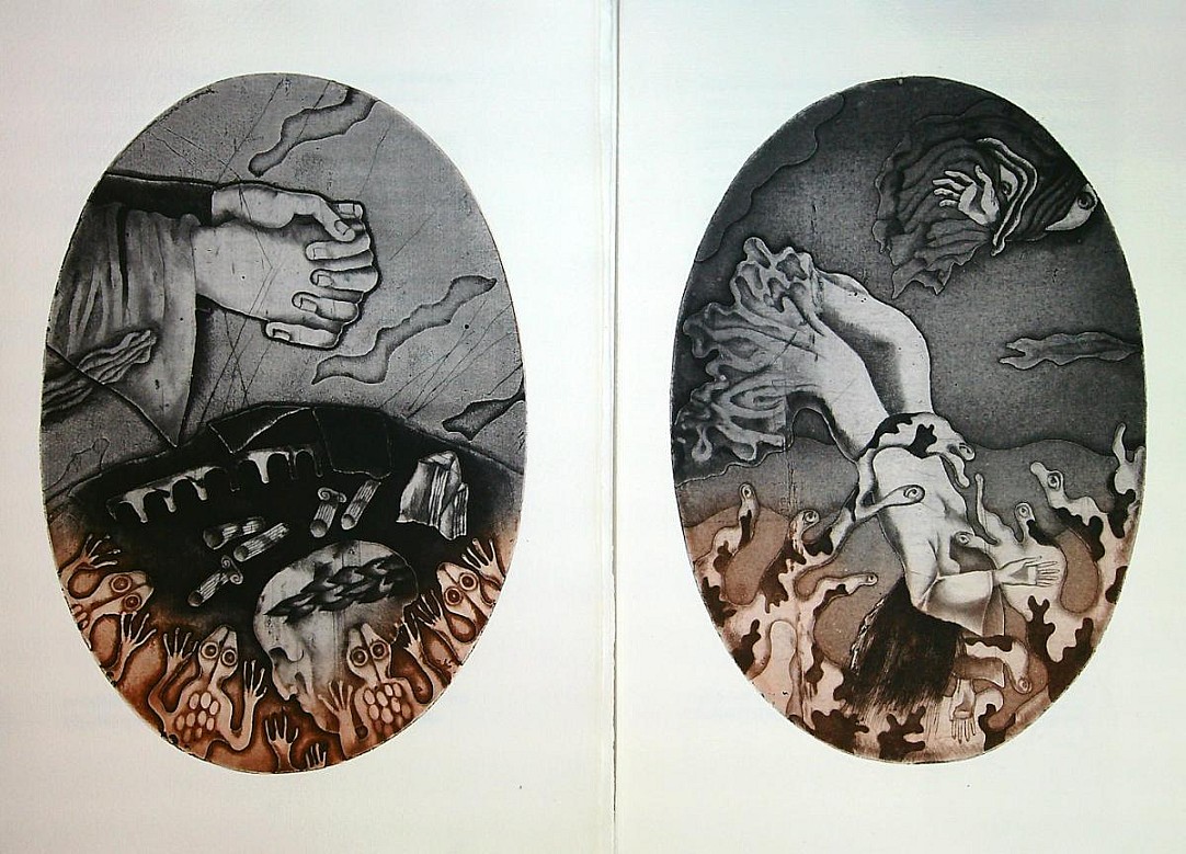 bibliofilie, 6x sign. serigrafie K. Kramule, vytiskl autor, 1986, s podpisem výtvarníka a autora nad tiráží, ruční papír losín, 50 výtisků (tento a.t.), volné archy v pův. ob. (6x), velmi dobrý stav, Aantiqari.at Radhošťská,
