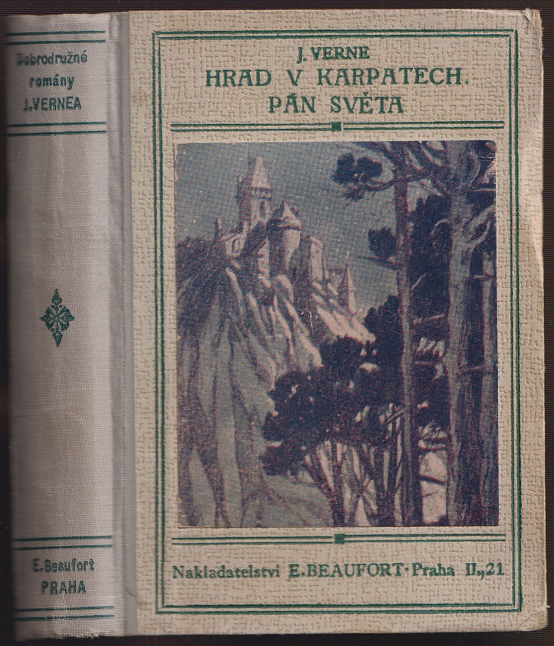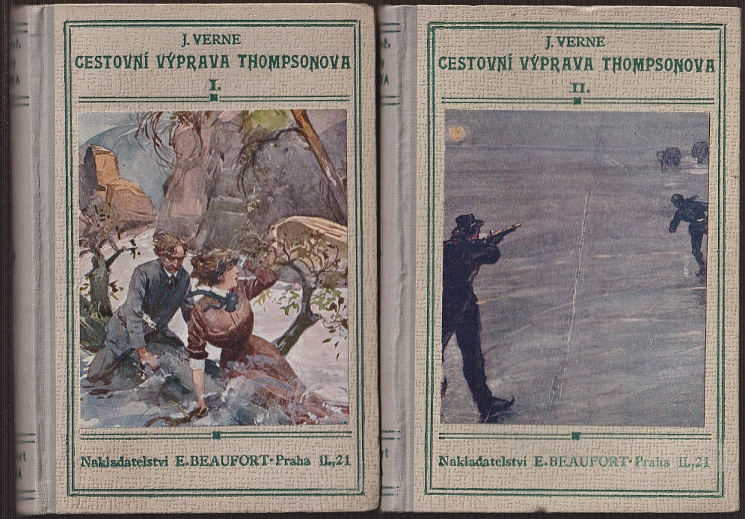 kniha, 2 svazky, Dobrodružné romány Julia Vernea, vydalo nakladatelství a knihtiskárna E. Beaufort v Praze, nedatováno, překlad Vítězslav Unzeitig, 285 + 279 s., plpl. nakladatelská vazba s nalepenou barevnou reprodukcí, zažloutlé listy, dobrý stav, Provenance: Antiquarian Ostrovní