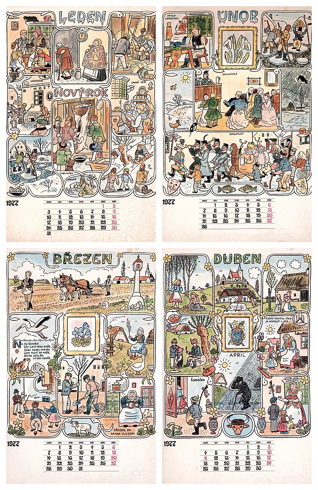 7x tisk, 45,5 x 30 cm, neúplný kalendář z roku 1977, mírně pokrčený a zažloutlý papír, Antikvariát Dlážděná, žák prof. A. Hofbauera, E. Dítěte a H. Jakesche na VŠUP v Praze, člen SVU Mánes a SČUG Hollar