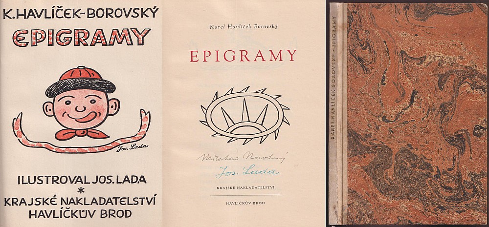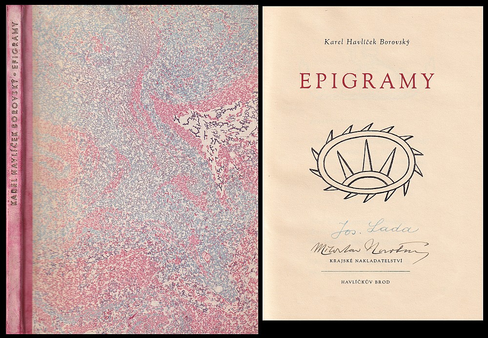 bibliofilie, podpis na tit. listě J. Lada a M. Novotný (doslov), vyd. Krajské nakladatelství, Havlíčkův Brod, 1949, ex. 398/500 na lepším papíře s faksimilem autografu Karla Havlíčka, polopergamenová převazba, pův. obálka vevázána, 90s., velmi dobrý stav, Antikvariát Ostrovní, žák prof. A. Hofbauera…