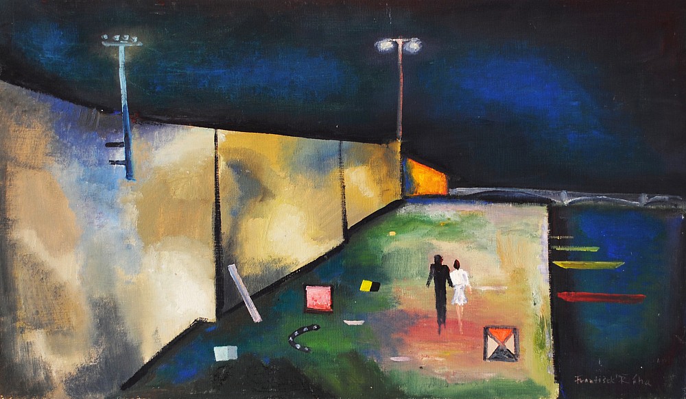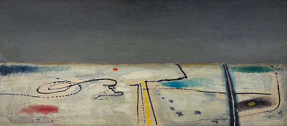 olej, sololit, 1984, 41 x 121 cm, sign. PD František Říha 84, rám, vzadu autorský štítek a razítko Z pozůstalosti malíře Františka Říhy, František Říha vystudoval architekturu na ČVUT v Praze, studoval u prof. Boudy, Lidického a Salcmana. Byl členem výtvarné skupiny Radar, která oficiálně vznikla v …