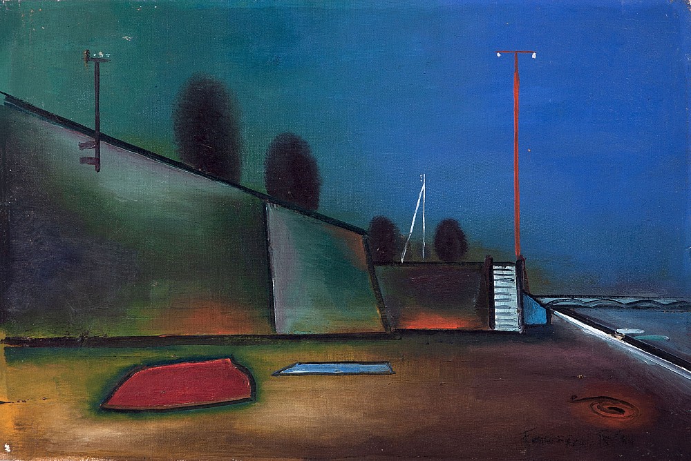 olej, sololit, 35 x 52 cm, sign. PD František Říha, malba je autentickou ukázkou české civilistní krajinomalby, která v sobě nese silné ozvěny poetiky Skupiny 42. František Říha zde zachycuje městské nábřeží s příznačným smyslem pro melancholii a ticho všedního dne. Kompozice je budována skrze výraz…
