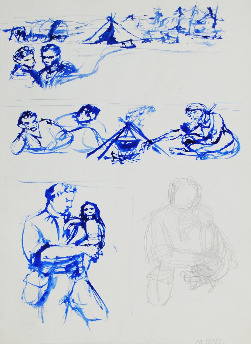 atrament, tužka, papír, 30 x 20 cm, kresba z obou stran papíru, lehce zašlý papír, z jedné strany nepatrné nažloutlé skvrnky, Antiqari.at Radhošťská, antiqari.at Radhošťská