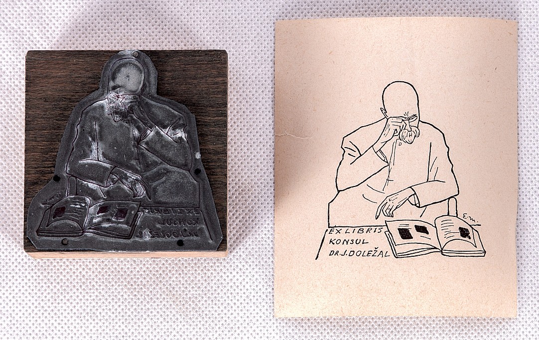 štoček a ex libris, 6,2 x 6,3 cm, monogr. PD v desce E. M., kovová grafická deska pro tisk ex libris Dr. Jaromíru Doležalovi, přiložen ex libris pořízený z desky, Provenance: Antiquarian Dlážděná, the disciple of prof. E. Dite, J. Schikaneder, M. Svabinsky, member of The Group of Fine Artists in Brn…