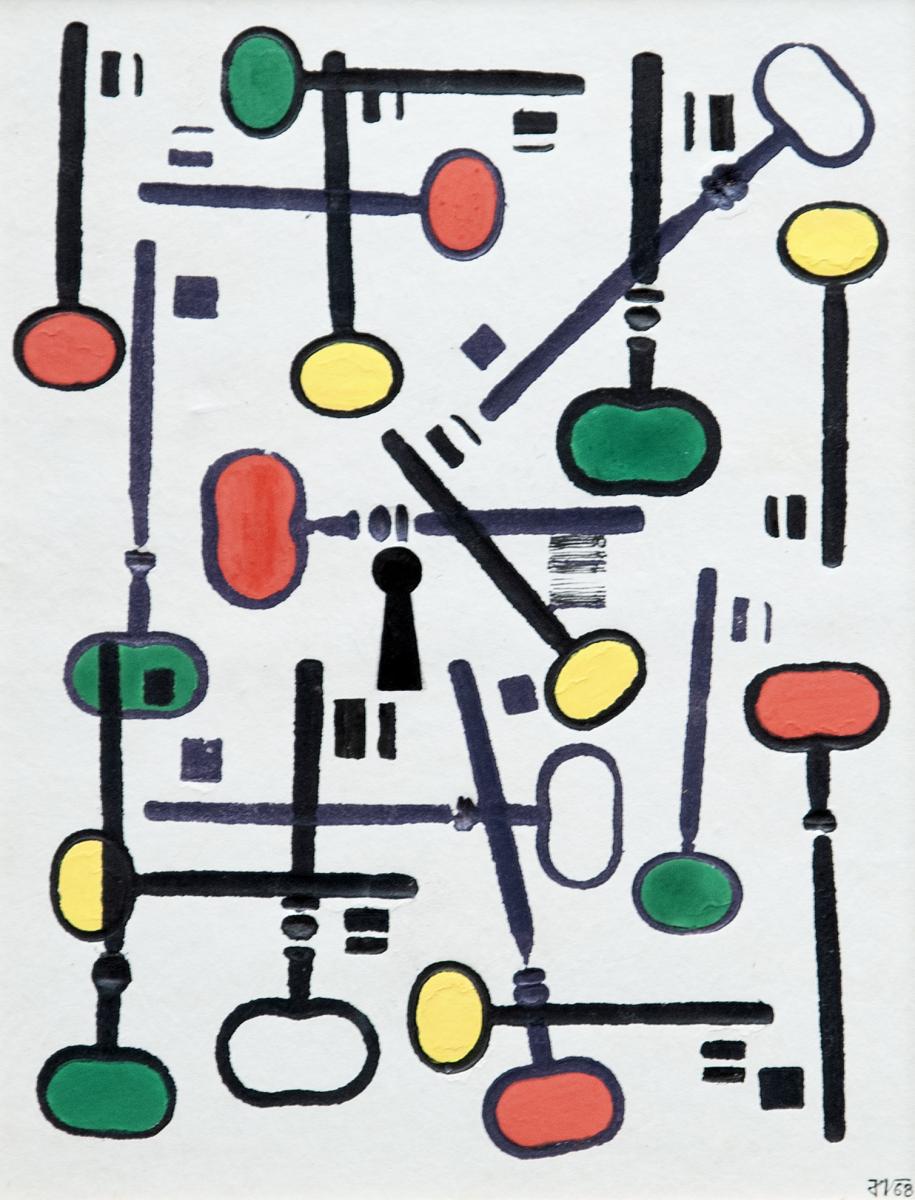 akvarel, tuš, papír, 28 x 21,5 cm, sign. PD JV 68, technika vtlačování předmětů do podkladu, Antikvariát Dlážděná